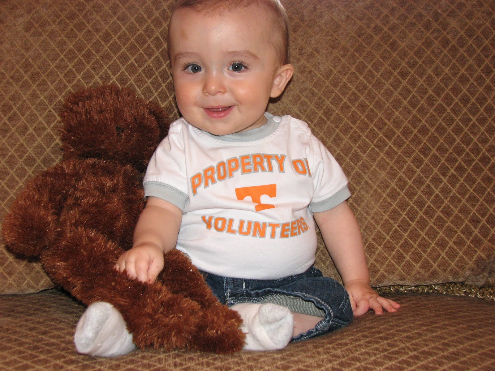 On March 24, Neyland turned 9 months old. I know I've said this before, but he is the sweetest, most precious little man! At nine months he has 4 teeth (2 tops and 2 bottoms), almost crawling, saying "dada" indescriminately and LOVES Hooper and William! At his 9 month well check up he is: